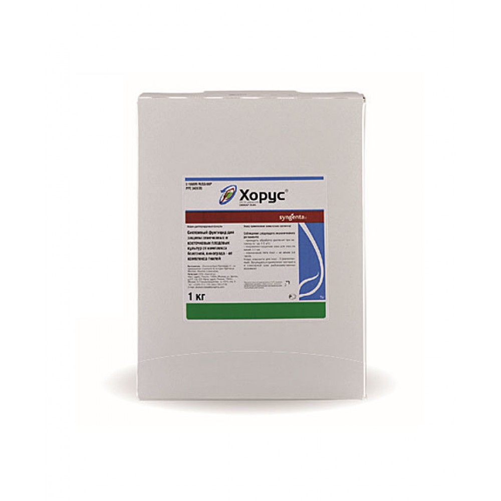 Хорус — системный фунгицид для защиты семечковых, косточковых плодовых культур и винограда от Syngenta (Швейцария). Действующее вещество: ципродинил (750 г/кг), ВДГ. Обладает высокой эффективностью при низких (+3°C) и высоких (+25°C) температурах, не смывается дождем через 2 часа. Эффективен против парши, монилиоза, коккомикоза, кластероспориоза, серой и белой гнили, альтернариоза.